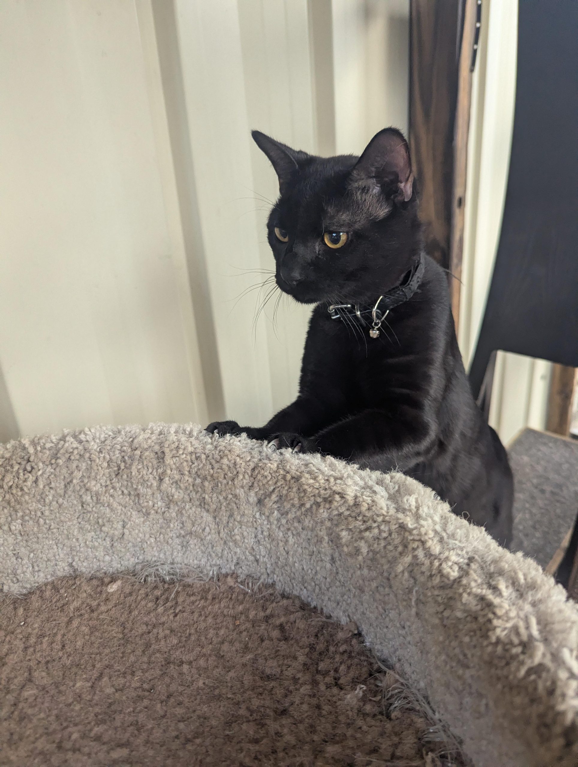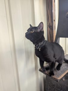 Dusk is a young male black cat who is a total sweetie. He’s friendly and curious. Dusk is ready to explore the world around him and learns something new everyday! He’s good with other cats and ready to find his forever home.