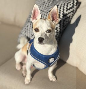 Stitch is vaccinated, heartworm negative, microchipped, and house-trained. He needs to be an *only pet* and is a total lap dog. He’s not a free roaming kind of guy, so he must have a secure fenced yard or be on a leash at all times when not in the house. He’s best with children over 12 and would love an experienced Chihuahua owner.